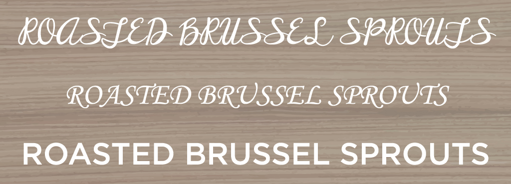 Skeptical? Look at the three different font styles used to describe the same menu item below. Pay attention to the assumptions you are making about the dish, about how it might taste and even the style of restaurant.
